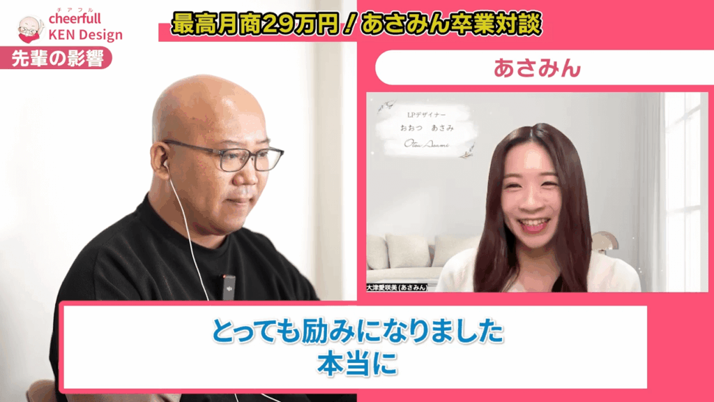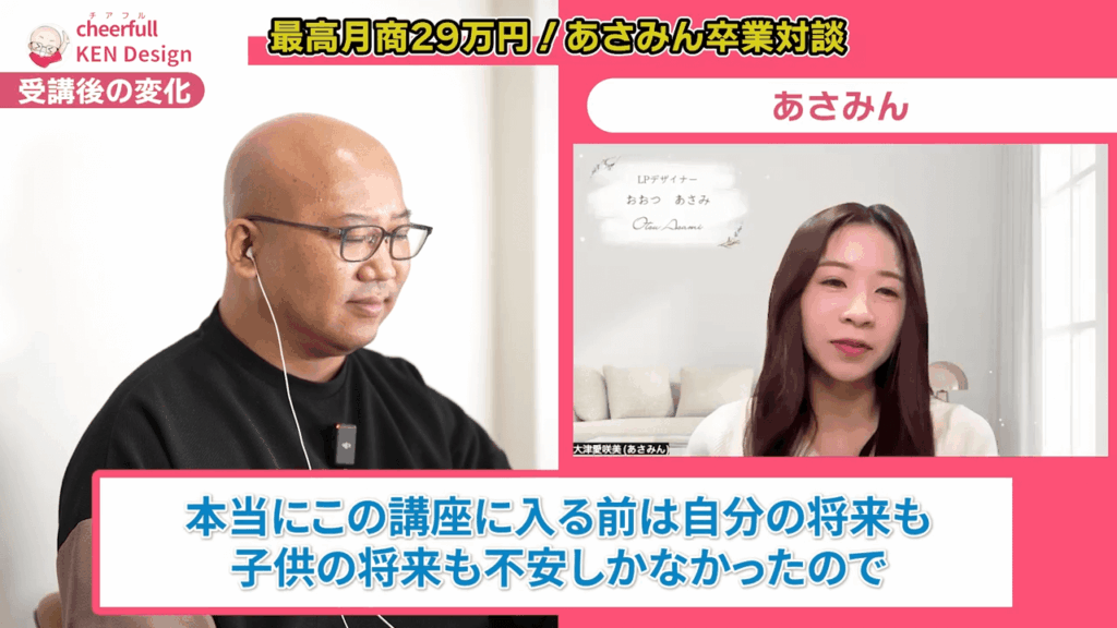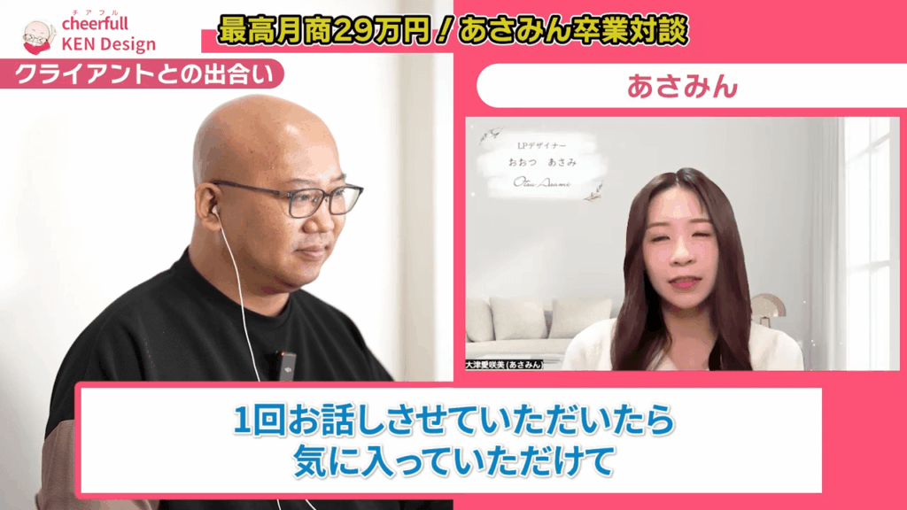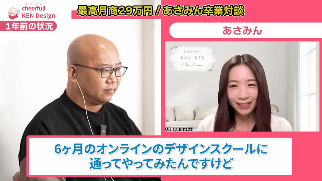 あさみん: はい。クラウドワークスなどで地道に頑張るように言われたのですが、私には子供の療育もあり時間があまりありませんでした。限られた時間でなるべく高単価で売上を作っていきたいと考えて、最初からLPデザインをターゲットに絞ってリサーチをしていたときにKenさんの動画に出会ったんです。